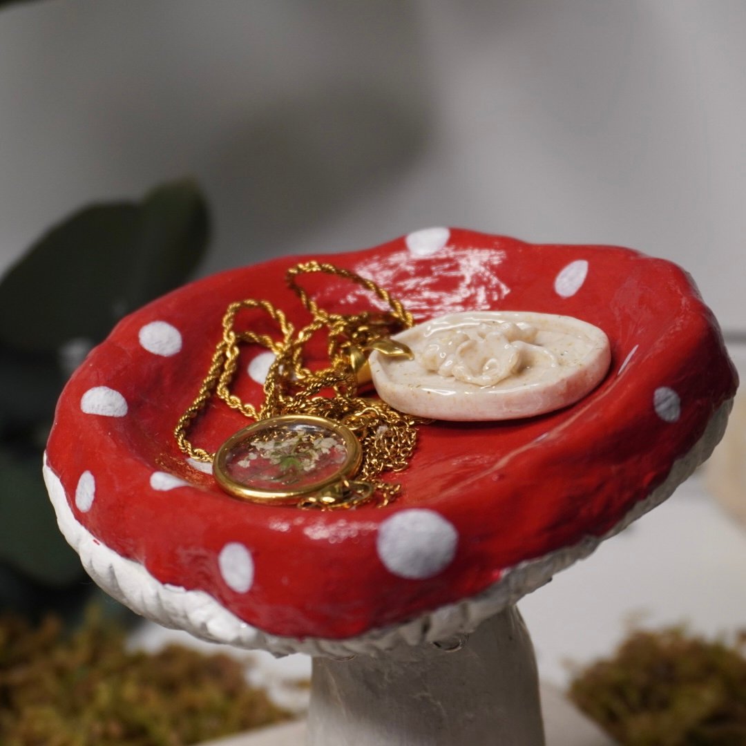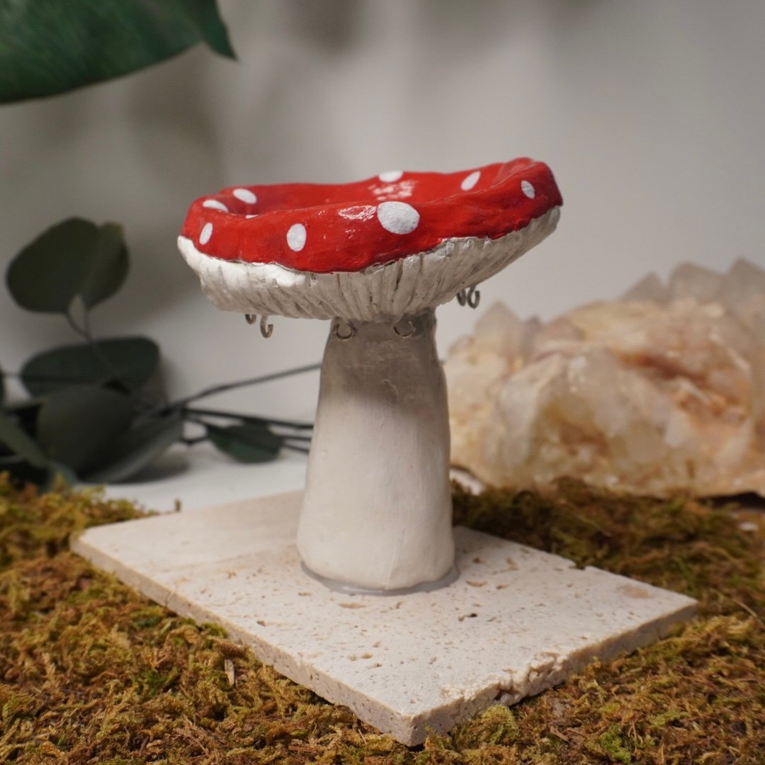 Support à bijoux en forme de champignon, fait à la main en polymère. Idéal pour suspendre boucles d’oreilles, bagues et petits bijoux, il ajoute une touche féerique et originale à votre espace tout en restant pratique et décoratif.