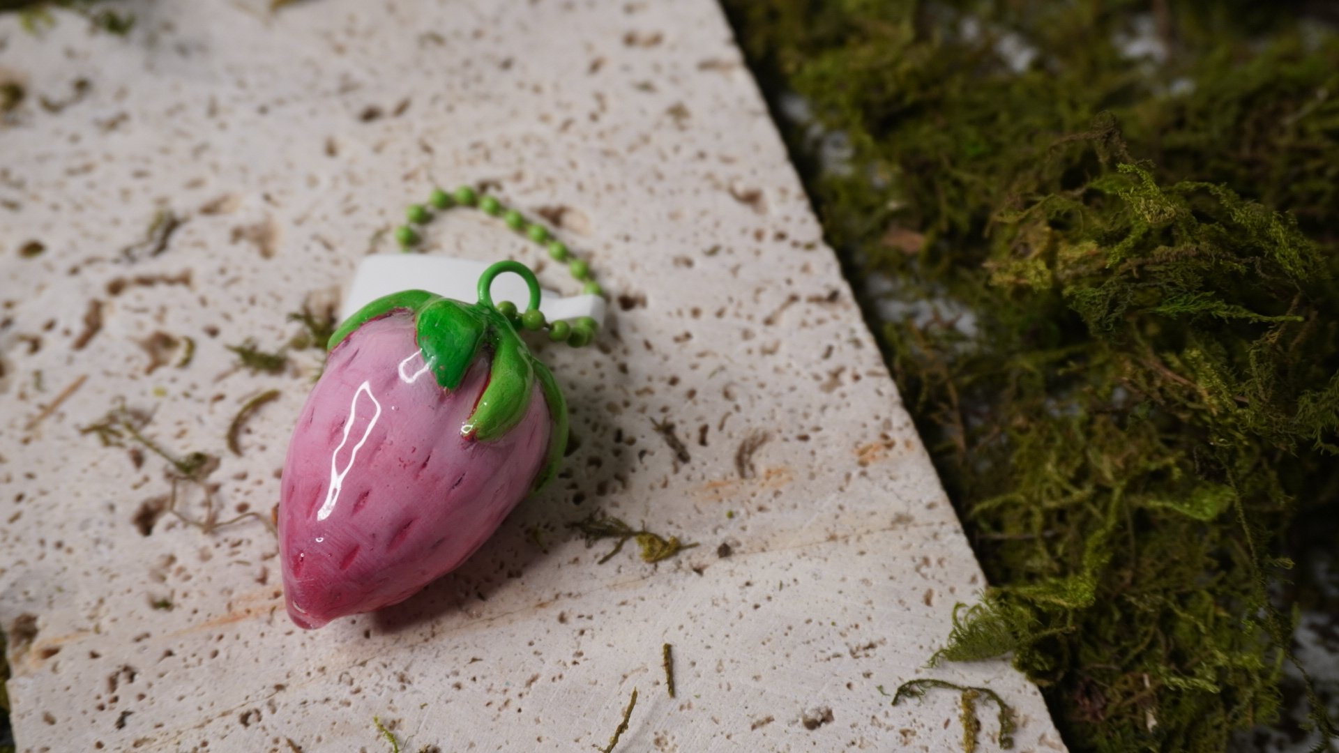 Petite fraise sculptée à la main en argile, recouverte de résine pour un fini brillant et résistant.