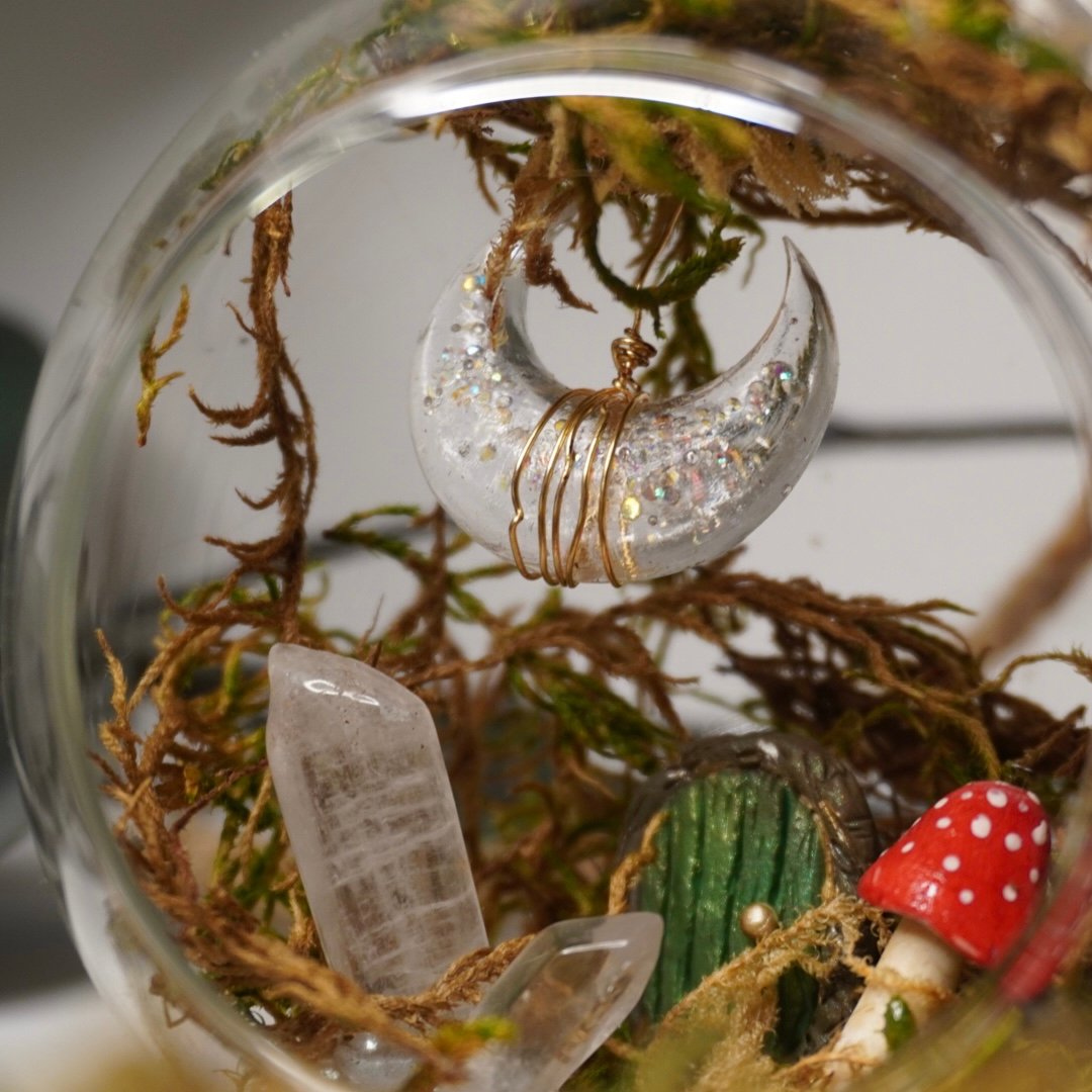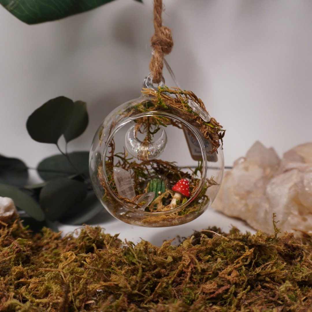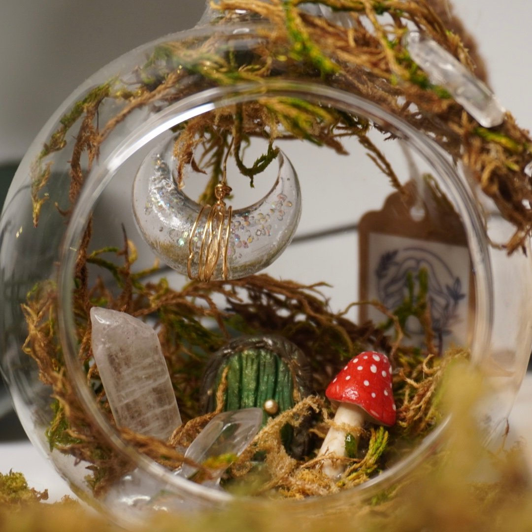 Sphère féerique à suspendre renfermant une petite maison enchantée, entourée de mousse, de cristaux et d’un croissant de lune scintillant. Il est possible d’y ajouter quelques gouttes d’huiles essentielles afin de diffuser une douce ambiance parfumée. Une décoration poétique, magique et apaisante pour harmoniser l’espace.