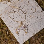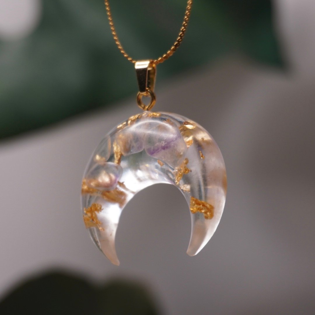 Pendentif en forme de lune renfermant des cristaux de quartz et d’améthyste ainsi que de fins éclats d’or, façonné en résine transparente et suspendu à une chaîne dorée en acier inoxydable. Une pièce lumineuse et céleste, symbole de clarté, d’intuition et d’harmonie.