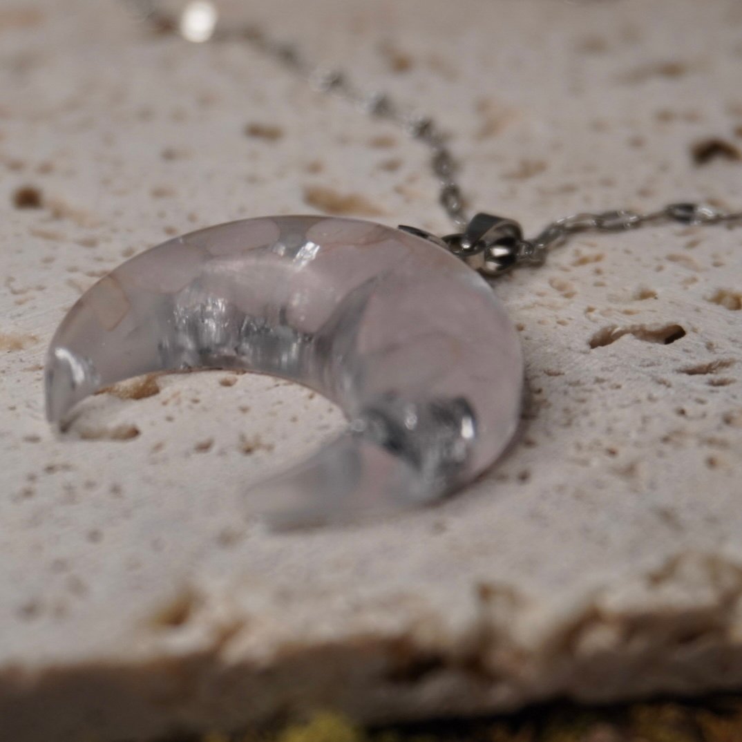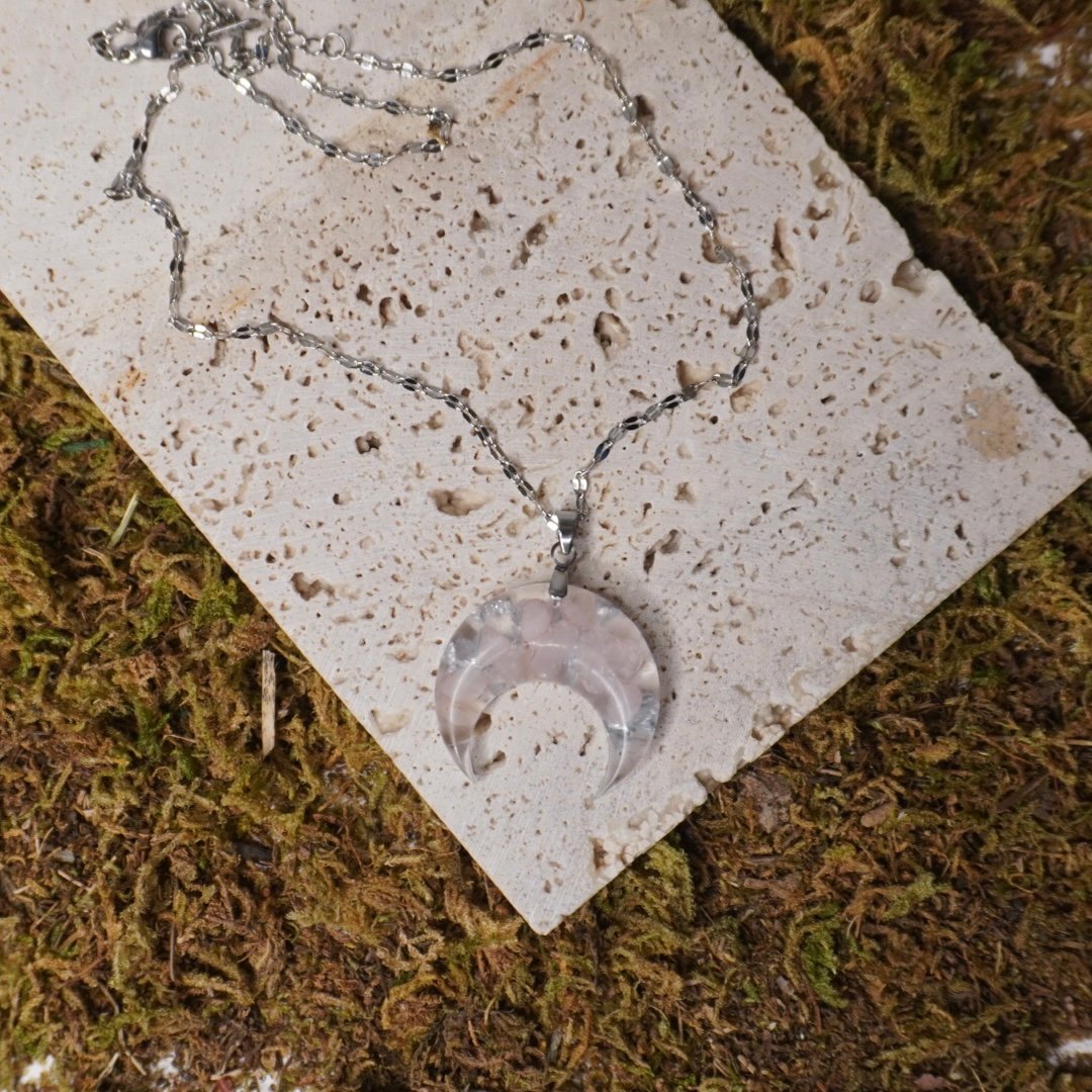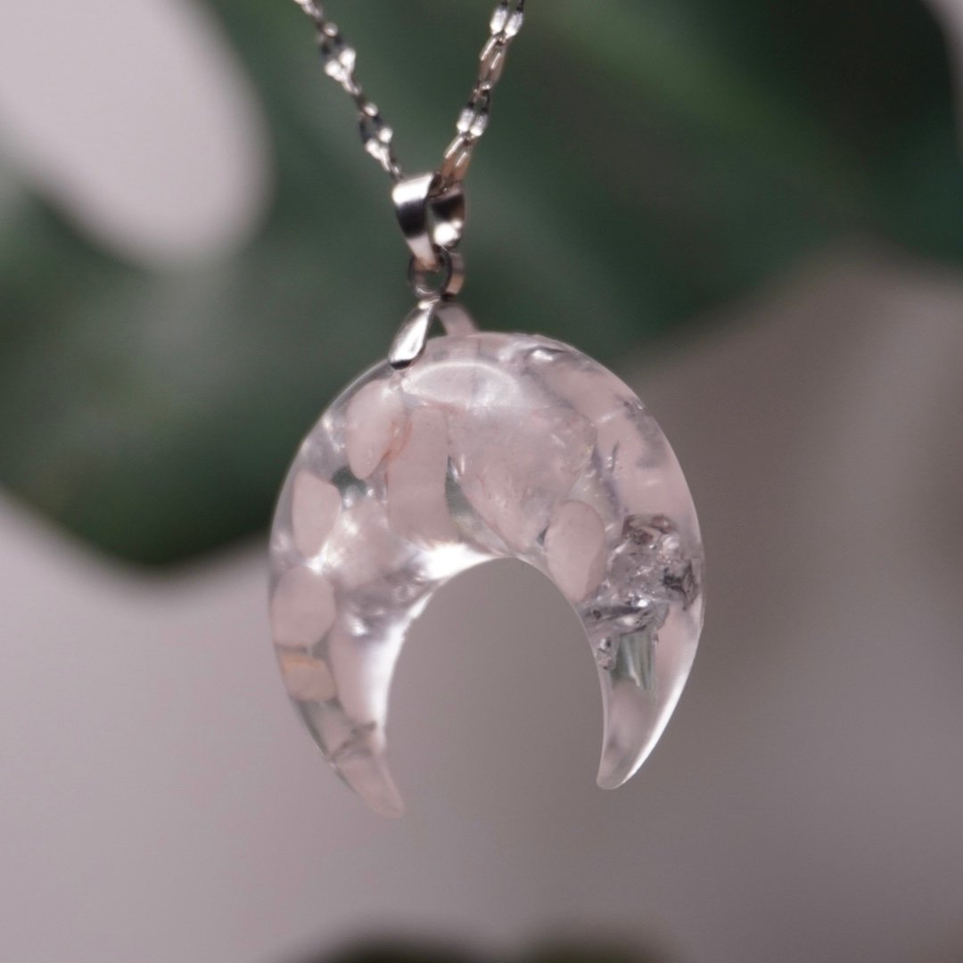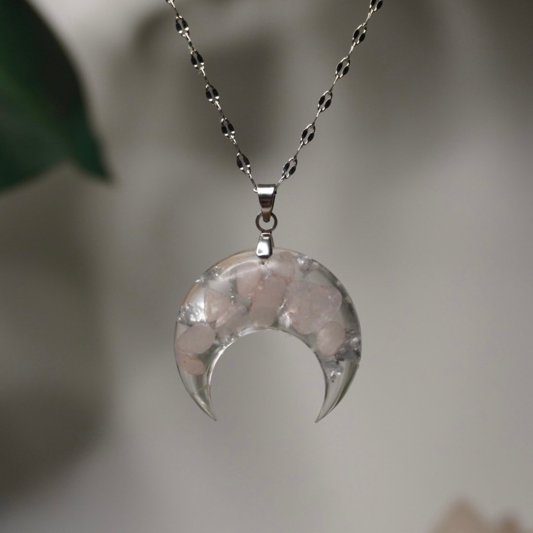 Pendentif en forme de lune renfermant de délicats cristaux de quartz rose, façonné en résine transparente et suspendu à une chaîne argentée en acier inoxydable. Une pièce douce et lumineuse, symbole d’amour, de calme et d’harmonie émotionnelle.